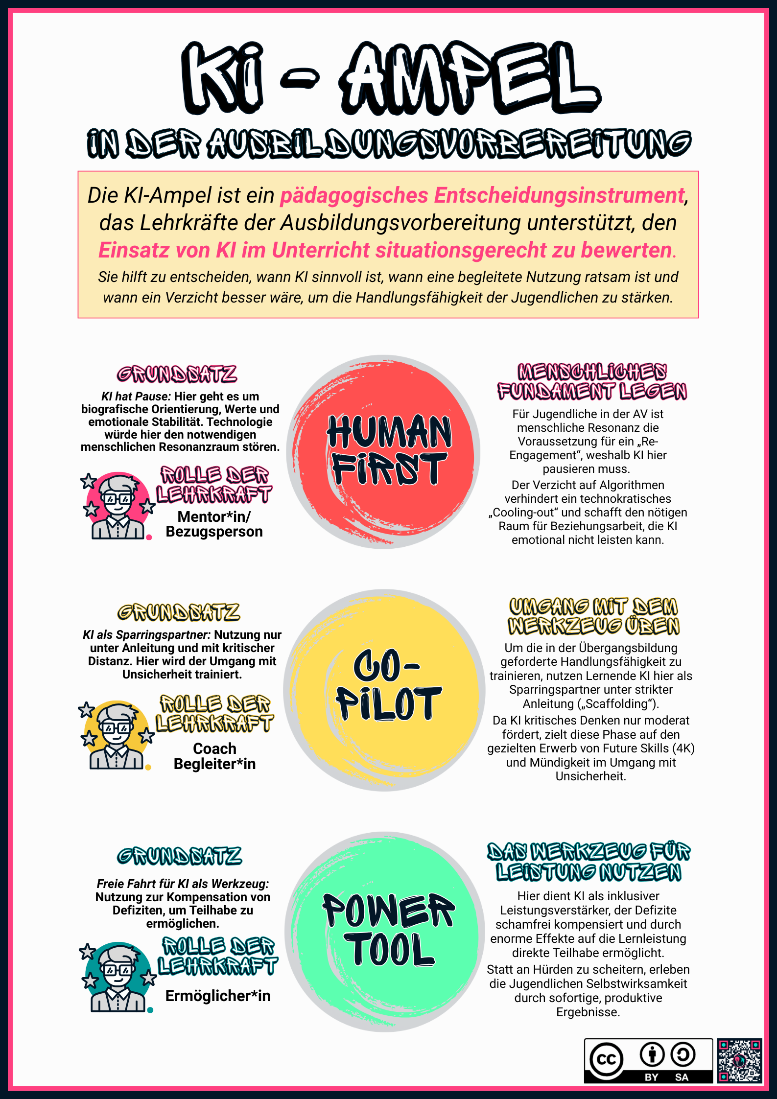 Die KI-Ampel versteht sich vor diesem Hintergrund nicht als Lösung, sondern als didaktische Leitlinie. Sie hilft, den Einsatz von KI im Unterricht der Ausbildungsvorbereitung bewusst zu reflektieren: Wo braucht es Beziehung und menschliche Orientierung? Wo kann KI Denkprozesse anregen und begleiten? Und wo kann sie als Werkzeug Teilhabe ermöglichen, ohne Lernprozesse zu verkürzen? Die Ampel lädt dazu ein, diese Fragen situativ zu stellen – immer ausgehend von den Lernenden und ihren jeweiligen Voraussetzungen.