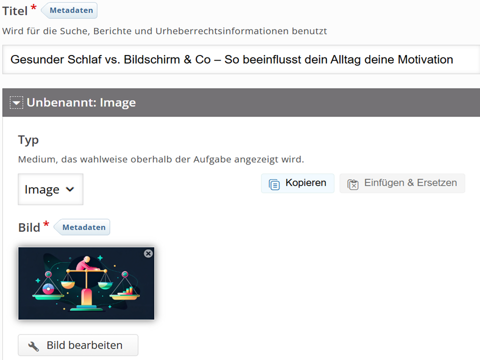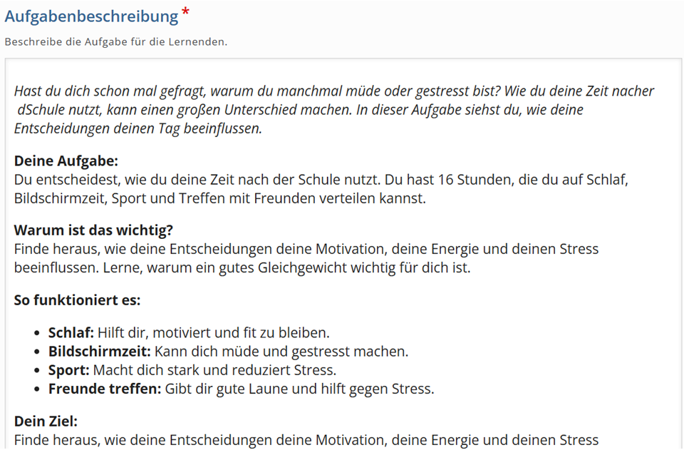 Was ist zu tun? Nachdem man einen prägnanten Titel eingetragen hat, lässt sich direkt darunter ein Bild, eine Audio‑Datei oder ein Video einbinden. Dieses Vorschaumedium rahmt das Szenario ein, weckt Neugier und liefert – je nach Wahl – erste inhaltliche Impulse, zum Beispiel ein Foto einer übervollen To‑do‑Liste, ein kurzer Podcast‑O‑Ton zur Schlafhygiene oder ein motivierender Clip. Gerade in Ausbildungsvorbereitungsklassen aktiviert ein passendes Medium Vorwissen, bietet Gesprächsanlässe und wertet das Setting auch optisch oder auditiv auf.