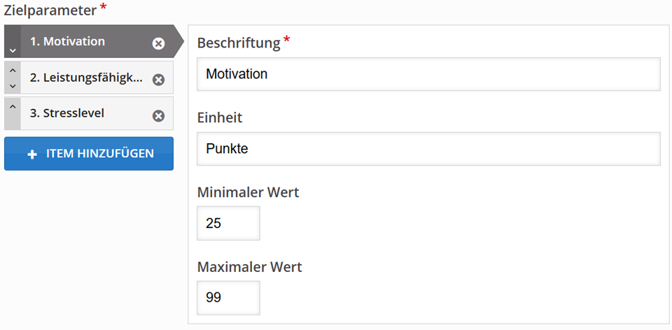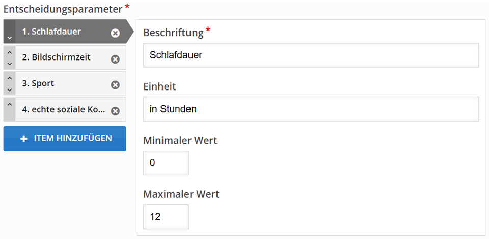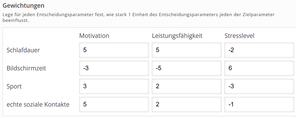 Jede 1 Einheit eines Entscheidungsparameters wirkt später in der Gewichtungsmatrix auf alle Zielparameter. Werden verschiedene Maßstäbe gemischt (etwa Stunden bei Schlaf und Minuten bei Bildschirmzeit), lassen sich Effekte kaum noch nachvollziehen. Besser ist, alle Zeiteinheiten zu harmonisieren oder, falls nötig, Umrechnungen vorzunehmen. Außerdem gilt: maximal drei bis fünf Entscheidungsparameter reichen völlig – zu viele Regler überfordern nicht nur den Editor, sondern auch die Lernenden.