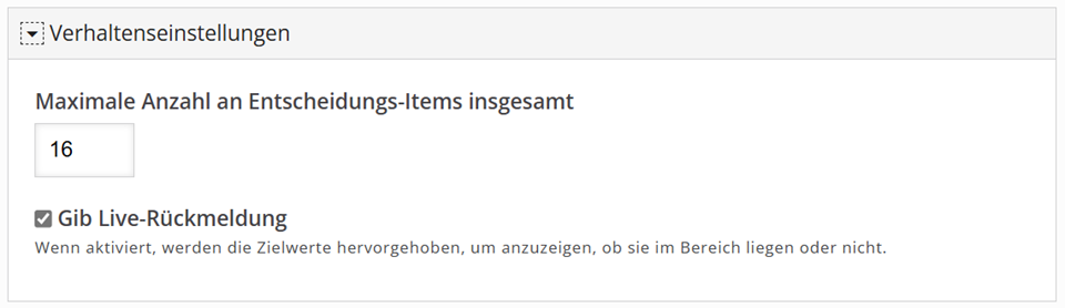 Maximale Anzahl Entscheidungs‑Items – steuert, wie viele Einheiten insgesamt verteilt werden dürfen. Wer – wie im Beispiel – nur 16 Stunden Freizeit‑ und Schlafzeit anbietet (die restlichen acht Stunden gehören zum Schultag), setzt die Obergrenze entsprechend. Eine Begrenzung auf etwa drei bis fünf Regler hilft zudem, dass Lernende den Überblick behalten.